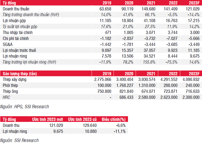 HPG công bố KQKD quý 4/2022 chính thức phù hợp với KQKD sơ bộ được công bố vào ngày 19/01, bao gồm doanh thu đạt 25,8 nghìn tỷ đồng (-42% YoY & 24% QoQ) và lỗ ròng 2,1 nghìn tỷ đồng, so với LNST ở mức 7,4 nghìn tỷ đồng trong quý 4/2021 và lỗ ròng 1,8 nghìn tỷ đồng trong quý 3/2022. Mặc dù sản lượng thép tiêu thụ tăng trưởng tích cực trong suốt năm 2022 với chi tiết sản lượng bán năm 2022 của từng sản phẩm: 4,2 triệu tấn thép xây dựng (+10% yoy), 2,6 triệu tấn thép cuộn cán nóng/HRC (+1% yoy), 750.000 tấn ống thép (+11% yoy) và 328.000 tấn tôn mạ (-23% yoy) nhưng chi phí tồn kho cao trong nửa cuối năm 2022 ảnh hưởng trực tiếp đến lợi nhuận của HPG với LNST sau lợi ích CĐTS đạt 8,5 nghìn tỷ đồng (-75% YoY).