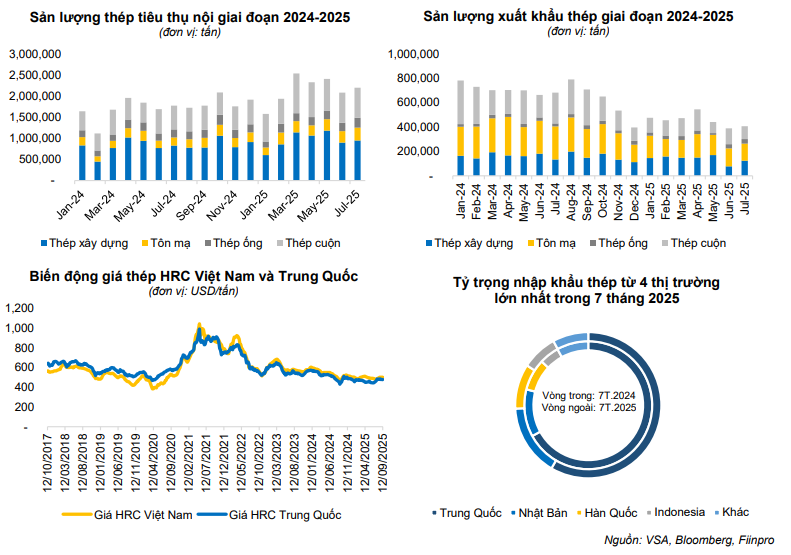 sản xuất thép trong nước. Trong bối cảnh dư thừa cung thép trên thế giới, Bộ Công Thương đã áp thuế chống bán phá giá thép HRC, tôn mạ từ một số quốc gia lớn như Trung Quốc, Hàn Quốc, Ấn Độ,… khiến sản lượng nhập khẩu thép Việt Nam giảm 7% so với cùng kỳ năm ngoái. Trong đó, lượng nhập khẩu từ Trung Quốc - thị trường chiếm tỷ trọng lớn nhất - giảm mạnh 20% so với cùng kỳ xuống 5,1 triệu tấn. Điều này giúp sản lượng sản xuất thép trong nước tăng 14,6% trong 7 tháng đầu năm và có thể duy trì mức tăng trưởng hơn 16% trong 2H2025. Ước tính sản lượng sản xuất thép trong nước cả năm 2025 khoảng 31,7 triệu tấn (+15,3%YoY). -