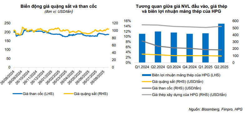 Theo Bloomberg, giá quặng sắt 62% và than cốc phục hồi từ cuối tháng 7 do Trung Quốc đang đẩy mạnh nhiều dự án hạ tầng quy mô lớn. Cụ thể, giá than cốc trung bình trong quý 3 dao động ở mức 188 USD/tấn, tăng 2,7% QoQ. Tương tự, trong quý 3, giá quặng sắt ở mức 100 USD/tấn, tăng 5,2% so với quý trước. Trong bối cảnh nhu cầu nội địa phục hồi, giá thép cũng điều chỉnh tăng theo giá nguyên liệu đầu vào, giá thép HRC và giá thép xây dựng đều tăng 3-5% so với quý 2. Cả năm 2025, giá quặng sắt và than cốc trung bình lần lượt 99 USD/tấn và 188 USD/tấn, giảm 10% và 24% so với 2024.