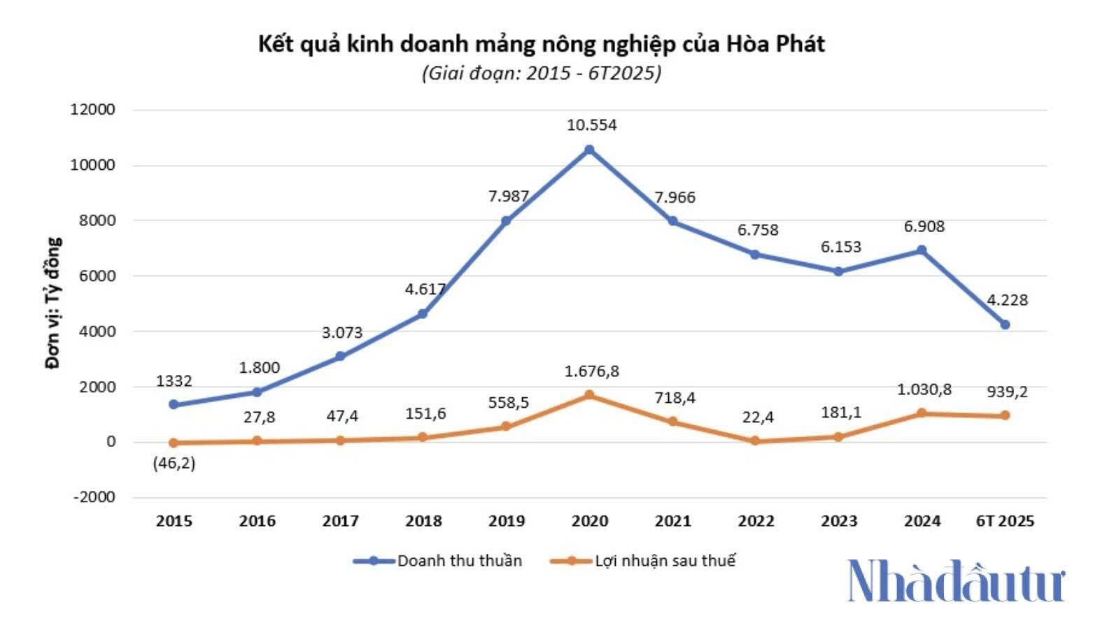 Về kết quả kinh doanh, Nông nghiệp Hòa Phát luôn có đóng góp lớn thứ 2 cho Tập đoàn Hòa Phát sau lĩnh vực cốt lõi là thép. Doanh thu thuần năm 2024 đạt 7.084 tỷ đồng, tăng 12,2% so với năm 2023. 6 tháng đầu năm 2025, Công ty ghi nhận 4.325 tỷ doanh thu, tăng mạnh so với cùng kỳ và bằng 61% cả năm 2024.