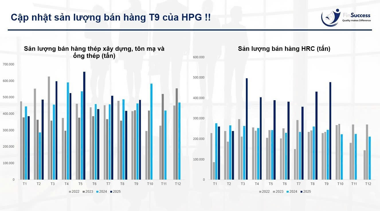 - HPG đã bán được 1.071.000 tấn thép (tính cả phối thép) trong tháng 9 tăng 39% YoY và 24% MoM, đưa sản lượng thép bán ra trong quý 3 năm 2025 lên 2.801.683 tấn, tăng 19% YoY (mặc dù giảm 4% MoM do tính mùa vụ) hoàn thành 97% dự phóng của FinSuccess. Và lũy kế 9 tháng đầu năm sản lượng thép bán ra của HPG đã tăng 21% YoY, đạt 8.375.812 tấn