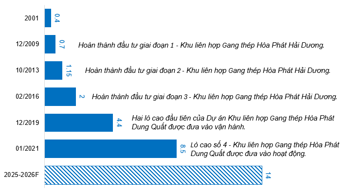 Dự án Nhà máy Dung Quất 2 của Hòa Phát đã bắt đầu đi vào hoạt động giai đoạn 1 từ tháng 3 năm 2025, với công suất đạt 1,4 triệu tấn thép HRC. Giai đoạn 2 của dự án này dự kiến sẽ tiếp tục vận hành từ tháng 9 năm 2025 và có khả năng đạt công suất tối đa vào đầu năm 2026.