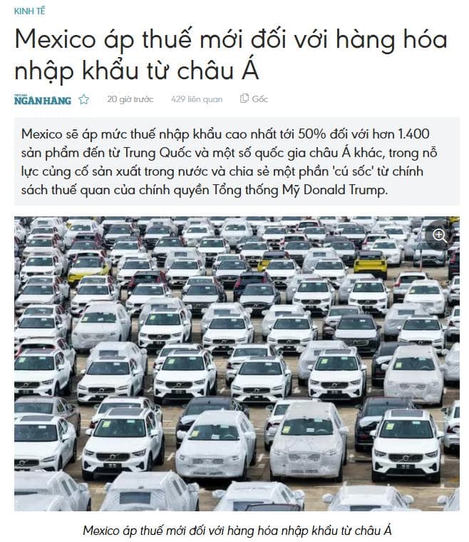 Mexico đang xem xét tăng thuế đối với hàng hóa, bao gồm cả sản phẩm thép, từ các quốc gia không có hiệp định thương mại tự do (FTA) với nước này. Động thái này chủ yếu ảnh hưởng đến các quốc gia như Trung Quốc, Hàn Quốc, Ấn Độ, Indonesia, Nga, Thổ Nhĩ Kỳ và Thái Lan, với mức thuế suất tiềm năng có thể lên tới 35%.