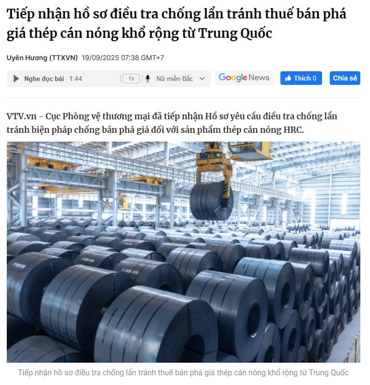 Ngày 18/09/2025, Cục Phòng vệ thương mại (Bộ Công Thương) đã ban hành thông báo chính thức về việc hồ sơ yêu cầu điều tra áp dụng biện pháp chống lẩn tránh thuế chống bán phá giá đối với thép cán nóng khổ rộng từ 1.880mm đến dưới 2.300mm có xuất xứ từ Trung Quốc đã được xác nhận đầy đủ và hợp lệ. Hồ sơ này do đại diện ngành sản xuất trong nước gồm Hòa Phát Dung Quất, Formosa Hà Tĩnh nộp ngày 10/09/2025.