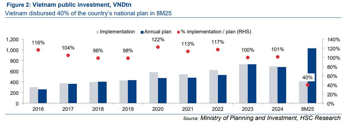 FM Fund kỳ vọng đà giải ngân đầu tư công sẽ phục hồi mạnh mẽ trong Q4/25, sau khi việc sắp xếp bộ máy hành chính đã hoàn tất kể từ ngày 15/09 và dữ liệu lịch sử cho thấy giải ngân thường tăng tốc vào cuối năm. Chi tiêu cả năm có thể vượt qua mức 440 nghìn tỷ đồng chỉ riêng trong Q4.