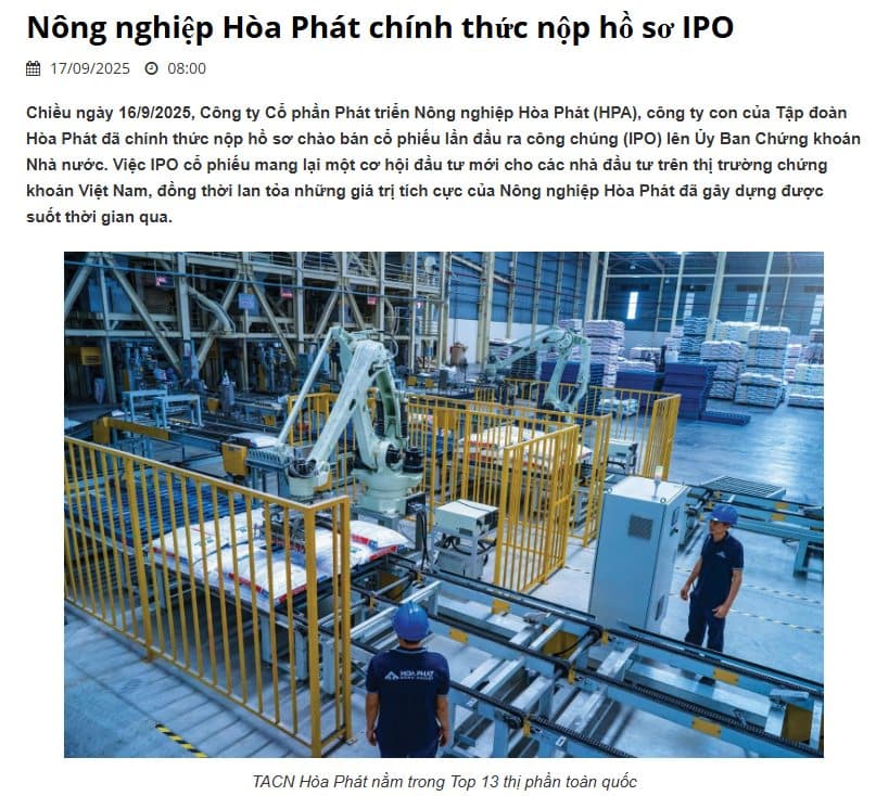 Chiều ngày 16/09/2025, CTCP Phát triển Nông nghiệp Hòa Phát (HPA) - công ty con của Tập đoàn Hòa Phát đã chính thức nộp hồ sơ chào bán cổ phiếu lần đầu ra công chúng (IPO) lên Ủy Ban Chứng khoán Nhà nước. Theo đó: