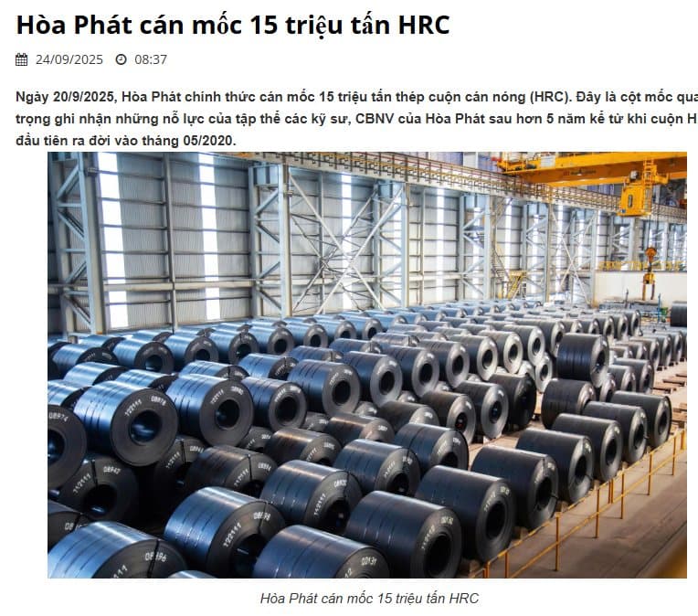 Ngày 20/9/2025, Hòa Phát chính thức cán mốc 15 triệu tấn thép cuộn cán nóng (HRC).