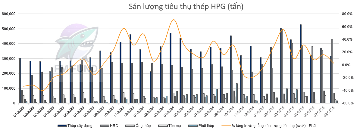 Theo dữ liệu của Hiệp hội Thép Việt Nam (VSA), HPG đã bán hơn 866 nghìn tấn thép trong tháng 8/2025, tăng 3% svck và đi ngang so với tháng trước đó (svtt). Cụ thể từng mặt hàng như sau: