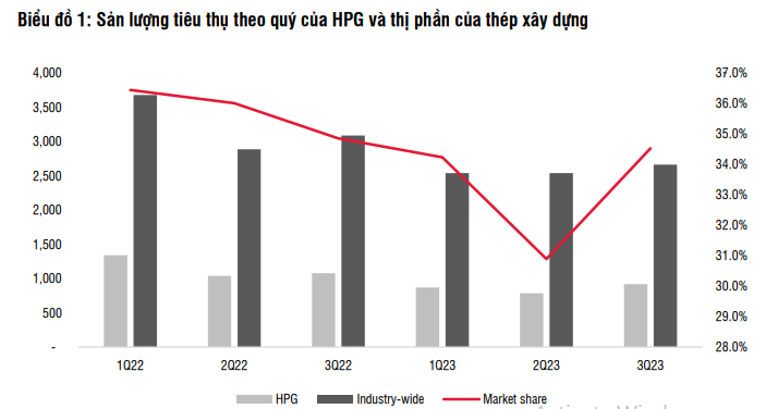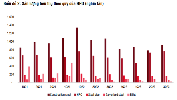 Sản lượng tiêu thụ HRC đạt mức cao kỷ lục, với 766,000 tấn bán ra trong quý 3/2023, tăng 25,5% so với cùng kỳ năm trước. Cải thiện đáng kể trong kênh xuất khẩu đã đóng góp tích cực, với 433,000 tấn xuất khẩu, chiếm 56,5% tổng khối lượng bán ra trong quý. Tuy nhiên, sản lượng tiêu thụ HRC nội địa giảm 45,5% so với cùng kỳ năm trước.
