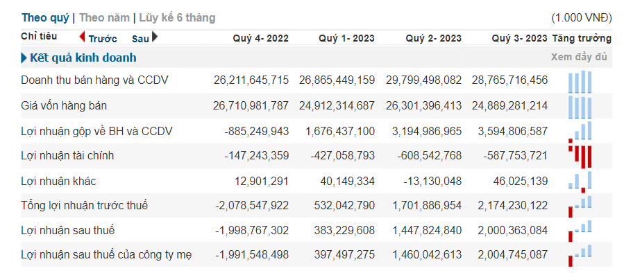 Trong quý 3/2023, Công ty Cổ phần Tập đoàn Hòa Phát (HPG) ghi nhận doanh thu bán hàng và cung cấp dịch vụ (CCDV) đạt 28,765 tỷ đồng, tăng 8,9% so với quý trước. Trong khi do đó, giá vốn hàng bán là 24,889 tỷ đồng, tăng 1,7% so với quý trước. Lợi nhuận gộp về bán hàng và CCDV là 3,594 tỷ đồng, tăng 12,4% so với quý trước.