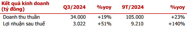 Kết quả kinh doanh của CTCP Tập đoàn Hòa Phát (HPG) trong Quý 3/2024 ghi nhận doanh thu đạt hơn 34 nghìn tỷ đồng, tăng 19% so với cùng kỳ năm trước (svck), và lợi nhuận sau thuế (LNST) đạt 3.022 tỷ đồng, tăng 51% svck. Tuy nhiên, so với quý trước, doanh thu giảm 14% và LNST giảm 9% do ảnh hưởng của mùa mưa đối với thị trường xây dựng. Lũy kế 9 tháng đầu năm 2024, doanh thu đạt gần 105 nghìn tỷ đồng, tăng 23% svck, và LNST đạt 9.210 tỷ đồng, tăng 140% svck. Với kết quả này, Hòa Phát đã hoàn thành 75% kế hoạch doanh thu và 92% kế hoạch LNST.