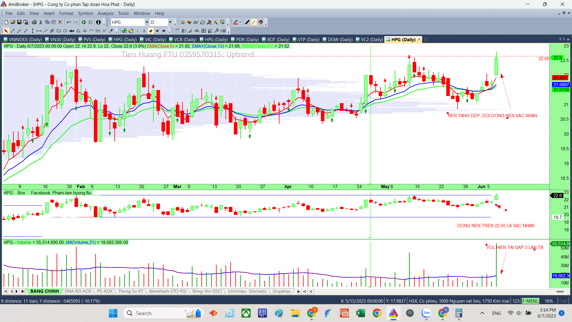 Như tiêu đề HPG hôm nay cần vượt 22,65 thì xác nhận vượt hộp darvas và xác nhận up trên phương diện kĩ thuật, trong phiên có lúc vượt nhưng đóng nến ở giá 22,6 thì dấu hỏi khá to.
