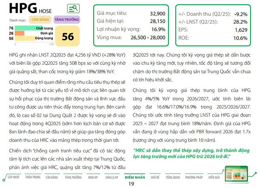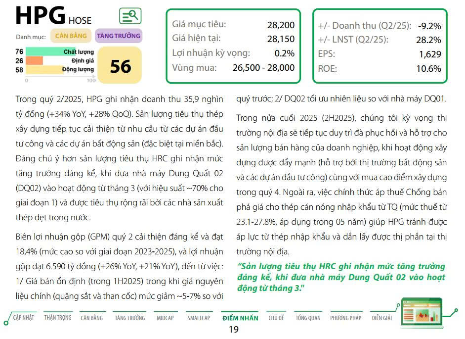 Đánh giá tổng quan: Kết quả sản lượng 7T2025 của HPG nhìn chung phù hợp với kỳ vọng, với điểm nhấn đến từ HRC tăng trưởng vượt bậc và thép xây dựng duy trì đà phục hồi. Dù Q3 có thể chịu ảnh hưởng mùa vụ, chúng tôi kỳ vọng HPG sẽ bước vào giai đoạn tăng tốc trong Q4/2025, khi nhu cầu xây dựng hồi phục và dự án DQ2 giai đoạn 2 đi vào vận hành.