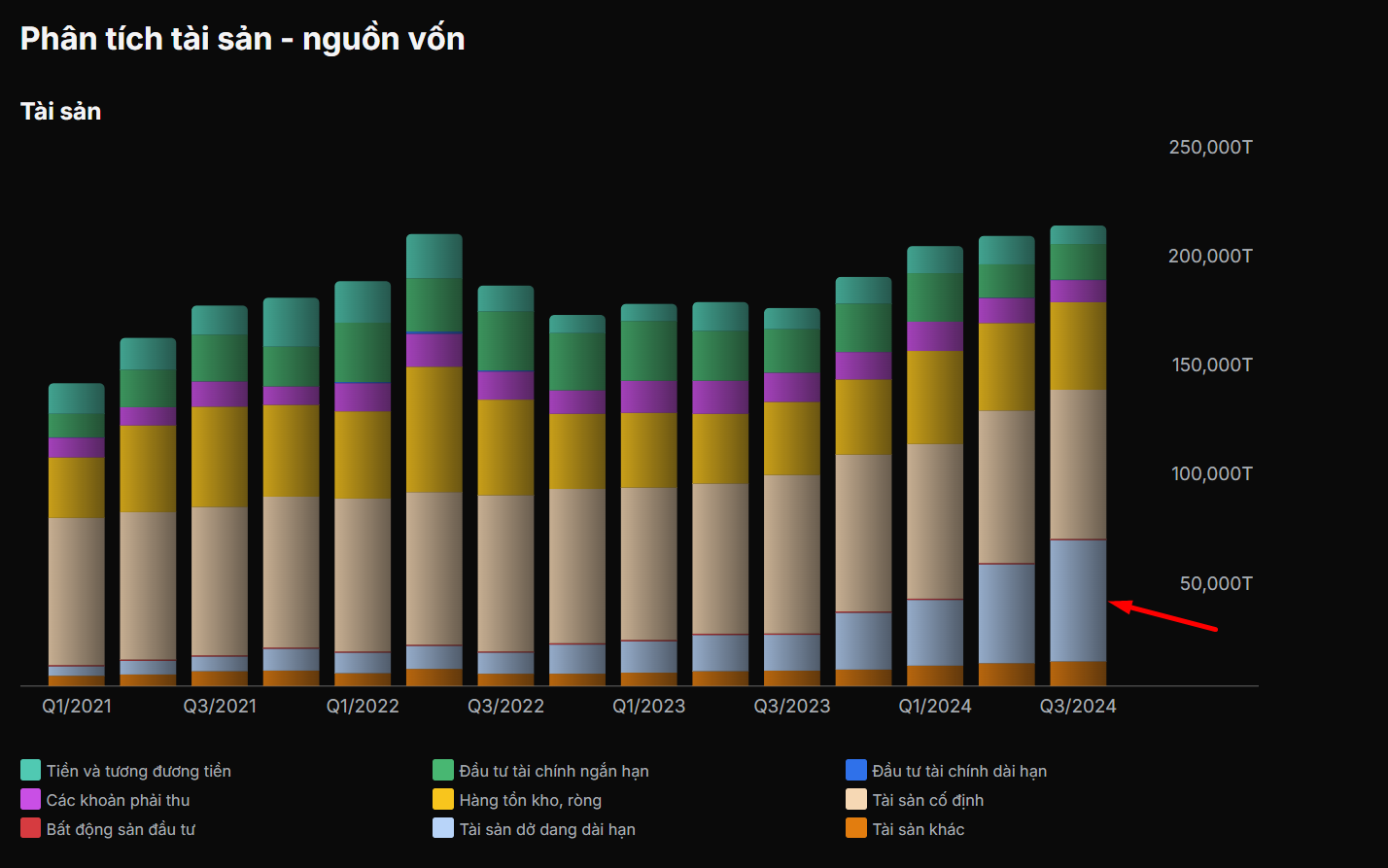 Trong Q3 – 2024 HPG đã tiếp tục đầu tư hơn 10 ngàn tỷ đồng vào Dung Quất 2 nâng tổng tài sản dở dang lên hơn 52 ngàn tỷ (¼ tổng tài sản cả tập đoàn)…