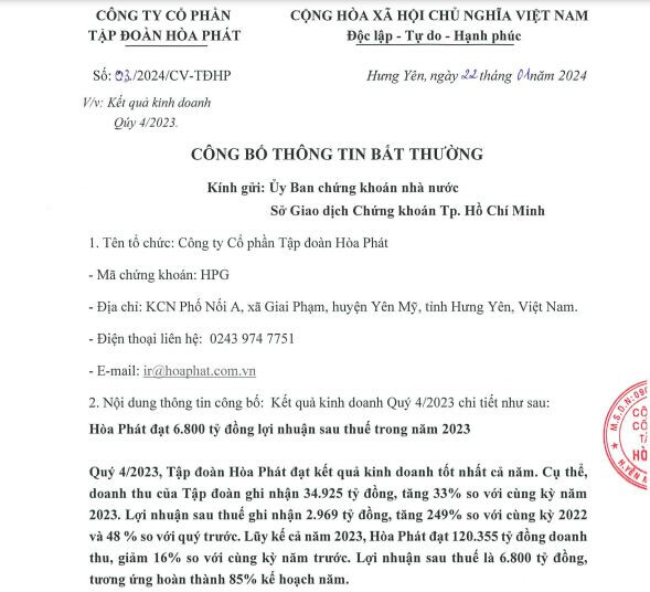 Hòa Phát vừa công bố KQKD Q4 2023 với con số cao nhất trong cả năm. Trong đó doanh thu thuần đạt 34.925 tỷ đồng, tăng 33% svck, lợi nhuận sau thuế đạt 2.969 tỷ đồng, tăng 249% svck và 48% so với quý trước.