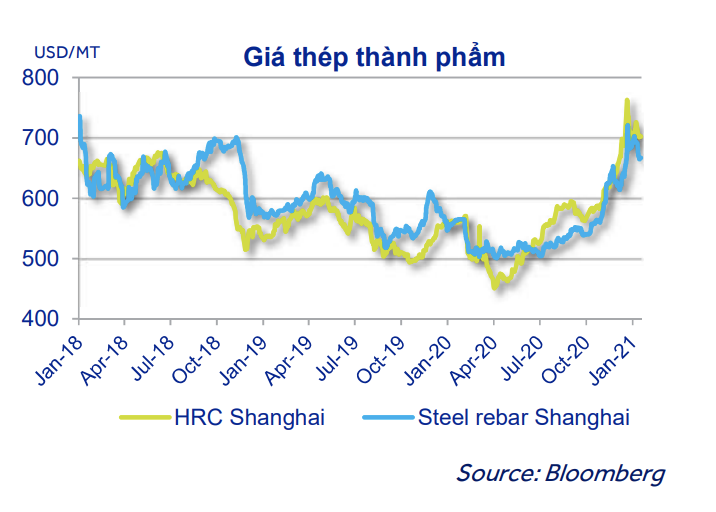 Giá quặng sắt nhập khẩu và giá thép phế liệu nhập khẩu để sản xuất các mặt hàng sắt thép thành phẩm tăng trên 30% so với đầu năm 2020. Các loại nguyên liệu sản xuất thép có giá cao đã dẫn đến giá HRC liên tục tăng từ tháng 8/2020 và đạt đỉnh vào cuối năm 2020 ở mức trên 700 USD/tấn.