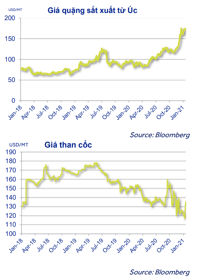 Báo cáo của ACBS chỉ ra rằng, Vale – nhà khai thác quặng lớn nhất thế giới – đã cắt giảm mạnh sản lượng khai thác trong năm 2020 do chưa thể khai thác bình thường kể từ vụ việc vỡ đập năm 2019. Công ty này cũng đang đặt một kế hoạch sản lượng thận trọng cho năm 2021. Việc sản lượng quặng bị cắt giảm đáng kể cộng với nhu cầu từ Trung Quốc đã khiến cho giá quặng sát trên thị trường tăng mạnh.