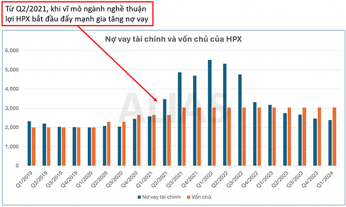 Do trước đó HPX đã khai thác gần hết quỹ đất trong thành phố Hà Nội, nên bắt bắt đầu từ năm 2021 khi vĩ mô ngành BĐS trở nên thuận lợi, lãi suất ở mức thấp, HPX đã đẩy mạnh gia tăng vay nợ nhằm tiếp tục thâu tóm và triển khai các dự án. Đỉnh điểm đến hết Q1/2022, tổng nợ vay tài chính của doanh nghiệp là 5.509 tỷ, gấp 1.8 lần so với vốn chủ sở hữu.