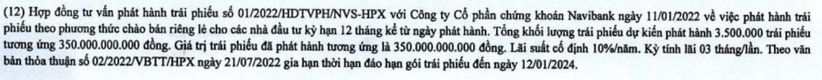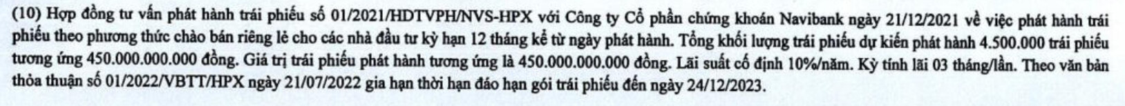 Về khoản vay của HPX, khoản trái phiếu sắp đến hạn hiện nay chỉ có 915 tỷ, do trong năm rồi HPX đã mua lại trước hạn hơn 1000 tỷ và tiến hành gia hạn các khoản vay.