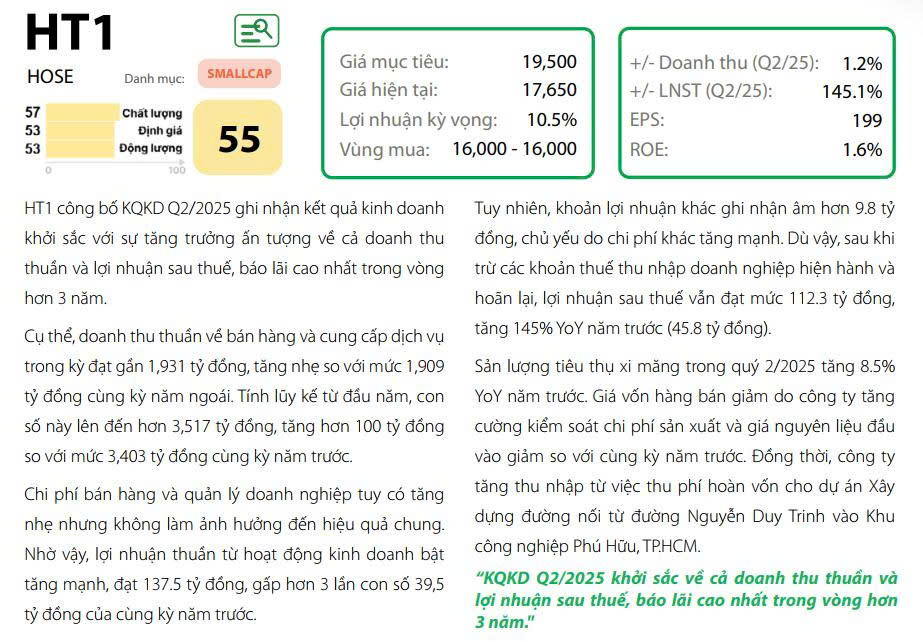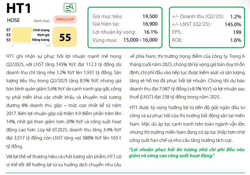 Với những yếu tố này, cổ phiếu HT1 được khuyến nghị Nắm giữ với giá mục tiêu 17.000 đồng/cổ phiếu, tương đương mức tăng khoảng 9% so với giá hiện tại.