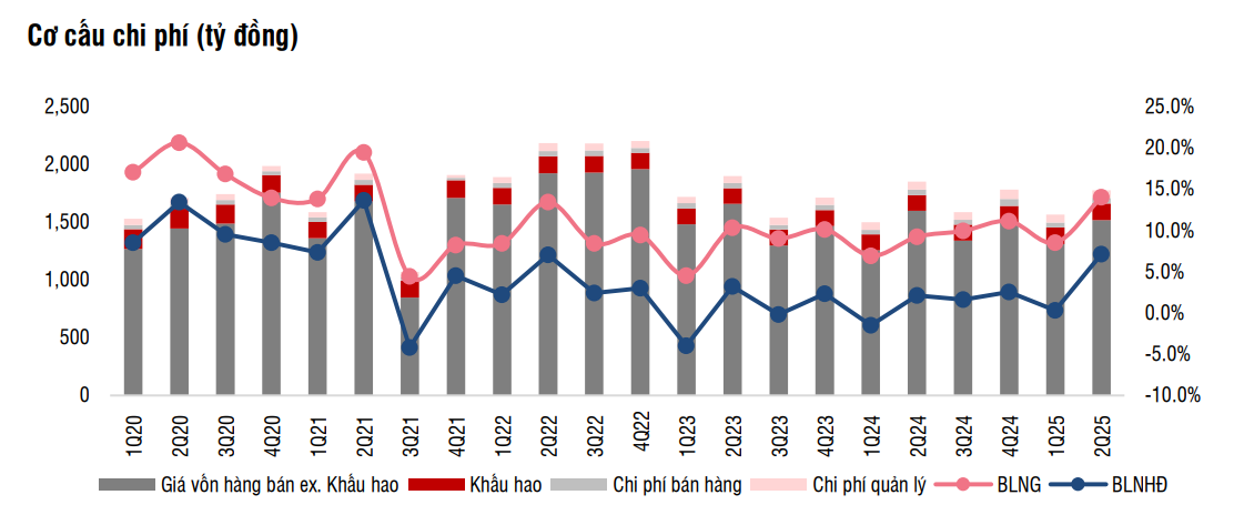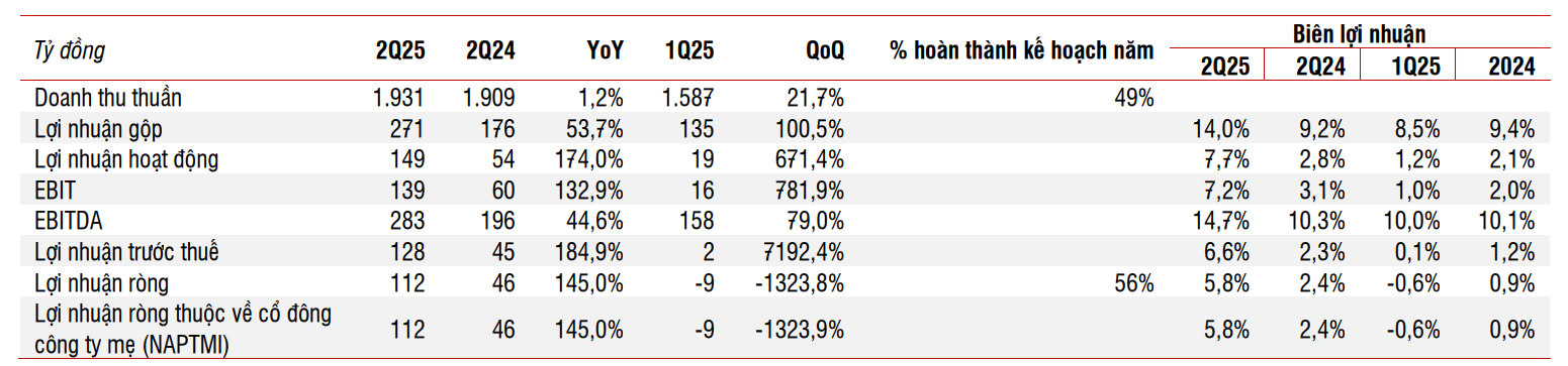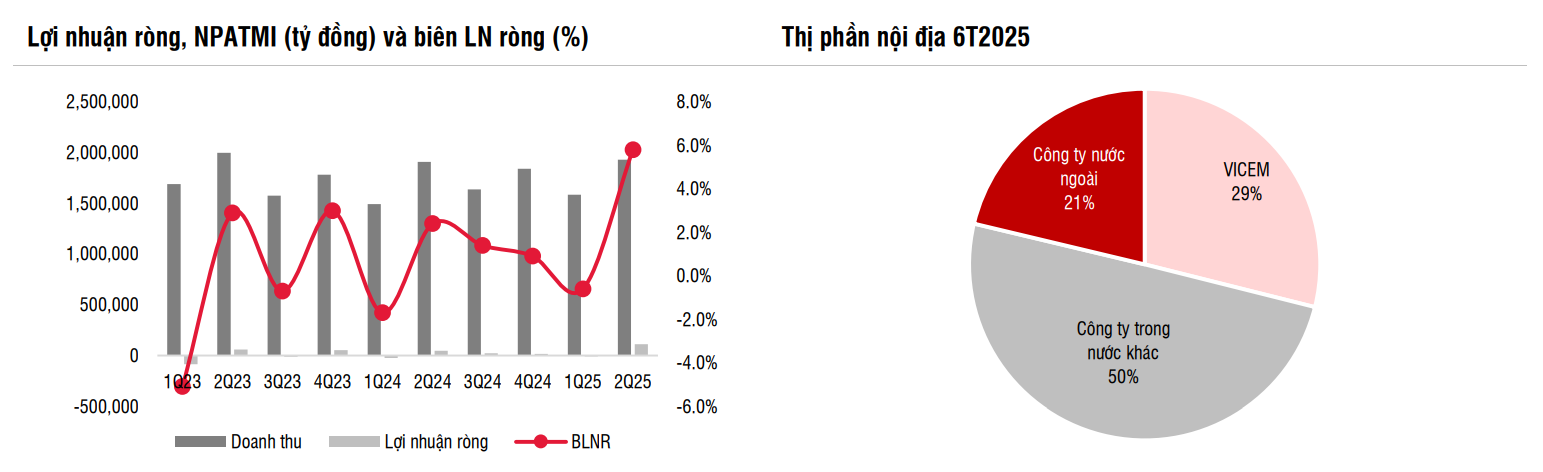 Trong Q2/2025, HT1 ghi nhận doanh thu thuần đạt 1.931 tỷ đồng, tăng nhẹ 1,2% svck. Tuy nhiên, LNST đạt 112,3 tỷ đồng, tăng mạnh 145% svck. Kết quả này chủ yếu đến từ biên lợi nhuận gộp cải thiện 4,9 điểm phần trăm svck (từ 9,2% trong Q2/2024 lên 14% trong Q2/2025), nhờ sản lượng phục hồi tích cực và giá than đầu vào giảm mạnh. Lũy kế 6T2025, doanh thu đạt 3.517 tỷ đồng (+3,4% svck) và LNST đạt 103,1 tỷ đồng (tăng mạnh 388% svck).