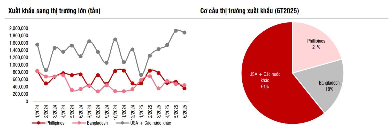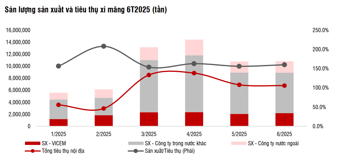 Ngành xi măng Việt Nam phục hồi tích cực trong 6T2025, với tổng sản lượng tiêu thụ xi măng và clinker đạt 54 triệu tấn (+14% svck). Động lực chính đến từ tiêu thụ nội địa, tăng 18% svck lên 37,5 triệu tấn nhờ hoạt động xây dựng hạ tầng và dân dụng cải thiện. Trong đó, VICEM đóng góp khoảng 11,7 triệu tấn. Xuất khẩu cũng tăng 6% svck, đạt 17 triệu tấn, chủ yếu nhờ sản lượng xuất clinker tăng 19%, trong khi xuất khẩu xi măng giảm nhẹ 2% svck. Tổng kim ngạch xuất khẩu đạt 635 triệu USD (+1,7% svck), với các thị trường chính gồm Philippines, Mỹ, Singapore và Malaysia.
