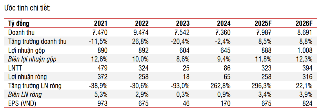 Điều chỉnh dự báo doanh thu đạt 7.987 tỷ đồng (+8,5% svck) và lợi nhuận sau thuế (LNST) đạt 258 tỷ đồng trong năm 2025. Sang năm 2026, dự báo doanh thu đạt 8.691 tỷ đồng và LNST đạt 316 tỷ đồng (+22,1% svck).