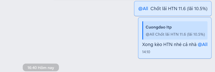 hôm qua, cổ phiếu HTN tiếp tục duy trì đà tăng trong phiên hôm nay, có lúc đạt +5%. Tuy nhiên, khi đóng cửa, HTN tạo râu nến dài, cho thấy áp lực bán xuất hiện mạnh. ![]()