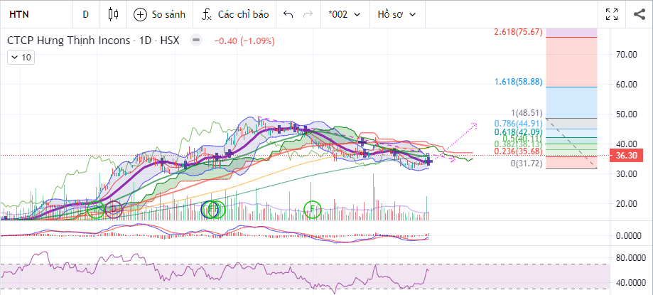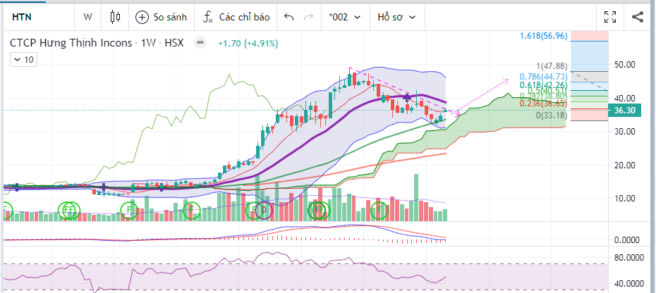 Về kỹ thuật TA: hiện tại HTN đã tích lũy chart tuần quanh MA100 và chart ngày quanh Ma200, dãy BB bó cung hẹp. Khuyến nghị với mục tiêu ngắn hạn là 45.000đ