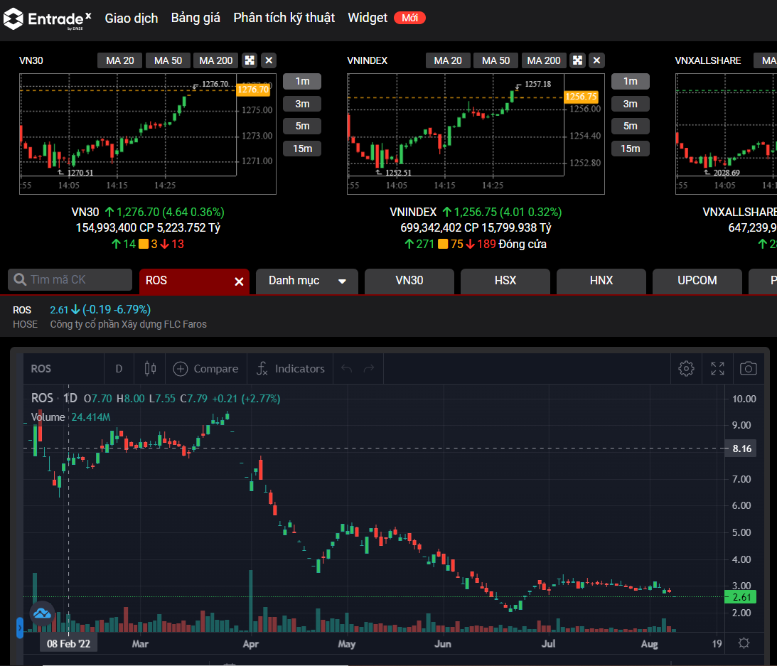Phiên hôm nay, ROS đã hãm đà giảm, chỉ còn mất 1,8% và đóng cửa tại 2.800 đồng/cổ phiếu, được giao dịch 7,2 triệu đơn vị, nhà đầu tư nước ngoài mua ròng 39.500 cổ phiếu. Trong phiên 3/8, ROS giảm sàn sau thông tin bị xem xét đình chỉ giao dịch; tiếp tục giảm thêm 3,4% phiên 4/8, khớp lệnh tới hơn 18 triệu đơn vị.