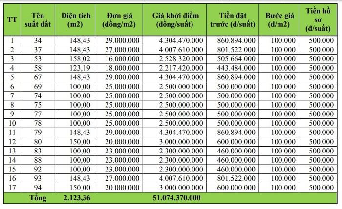 Diện tích các suất đất từ 95,6-120,8 m2. Đơn giá từ 11-16,2 triệu đồng/m2; tương đương giá khởi điểm từ 1,051 tỷ đến trên 1,6 tỷ đồng/suất. Thời gian tiếp nhận hồ sơ tham gia đấu giá đến trước 17h ngày 25/4. Người tham gia đấu giá nộp trước số tiền bằng 20% giá khởi điểm trên từng suất đất, trước 17h ngày 26/4.