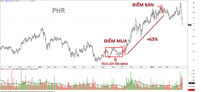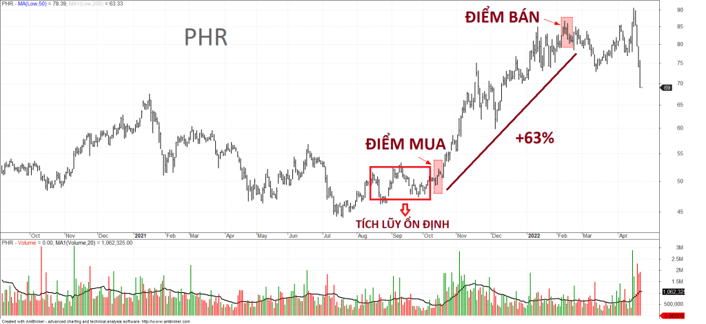 Cổ phiếu PHR có nhịp tăng rất mạnh từ nền tảng tích lũy ổn định và đến khi kết thúc xu hướng tăng thì cho mức sinh lãi 63%. Đây là điểm mua vừa an toàn mà lại vừa có mức sinh lãi rất tốt!