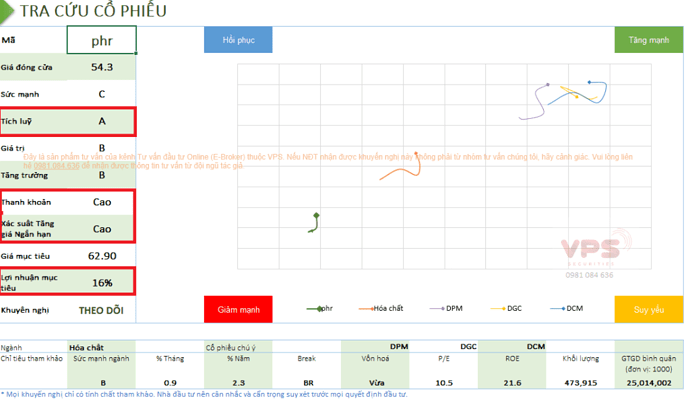 Cổ phiếu PHR ngày 14.10.2021 có trạng thái tích lũy A, các tiêu chí khác như xác suất tăng giá ngắn hạn cao và lợi nhuận mục tiêu cũng thỏa mãn. Ngoài ra, trong 1 năm vừa qua PHR cũng chưa mở sóng tăng mạnh nào khi % năm chỉ ở mức 2.3%, do đó đây được xem là điểm mua an toàn để đón bắt xu hướng tăng mới của cổ phiếu.