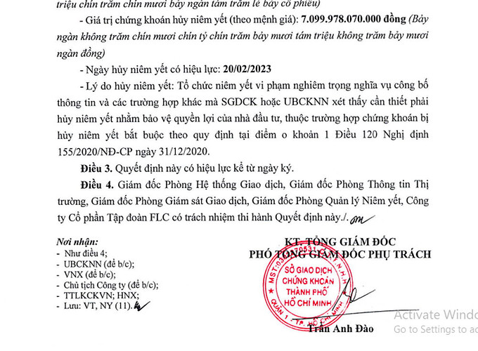 Sở Giao dịch Chứng khoán TP.HCM ra quyết định huỷ niêm yết gần 710 triệu cổ phiếu FLC từ ngày 20/2
