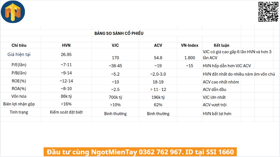 HVN (~7-11.x): Thấp hơn trung bình thị trường (15.x) và thấp hơn đáng kể so với VJC và ACV.
