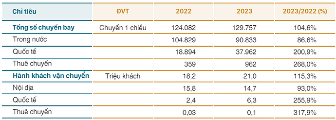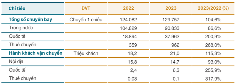 Số lượng chuyến bay khai thác năm 2023 của công ty mẹ tăng 4.6% lên 129.757 chuyến. Trong đó, số chuyến bay trong nước là 90.833 chuyến, chiếm 86.6%. Chuyến bay quốc tế tăng 200.9%, lên 37.962 chuyến so với cùng kỳ. Tổng cộng, VNA đã phục vụ 21 triệu lượt khách trong năm vừa qua, tăng 15.3% so với cùng kỳ.