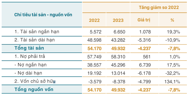Tổng tài sản của Vietnam Airlines giảm 4.237 tỷ đồng so với cùng kỳ năm 2022, xuống mức 49.932 tỷ đồng. Nguyên nhân chủ yếu là do tài sản dài hạn giảm 5.316 tỷ đồng, trong khi tài sản ngắn hạn chỉ tăng 1.078 tỷ đồng. Vốn chủ sở hữu cũng giảm 4.799 tỷ đồng, xuống mức âm 8.378 tỷ đồng.