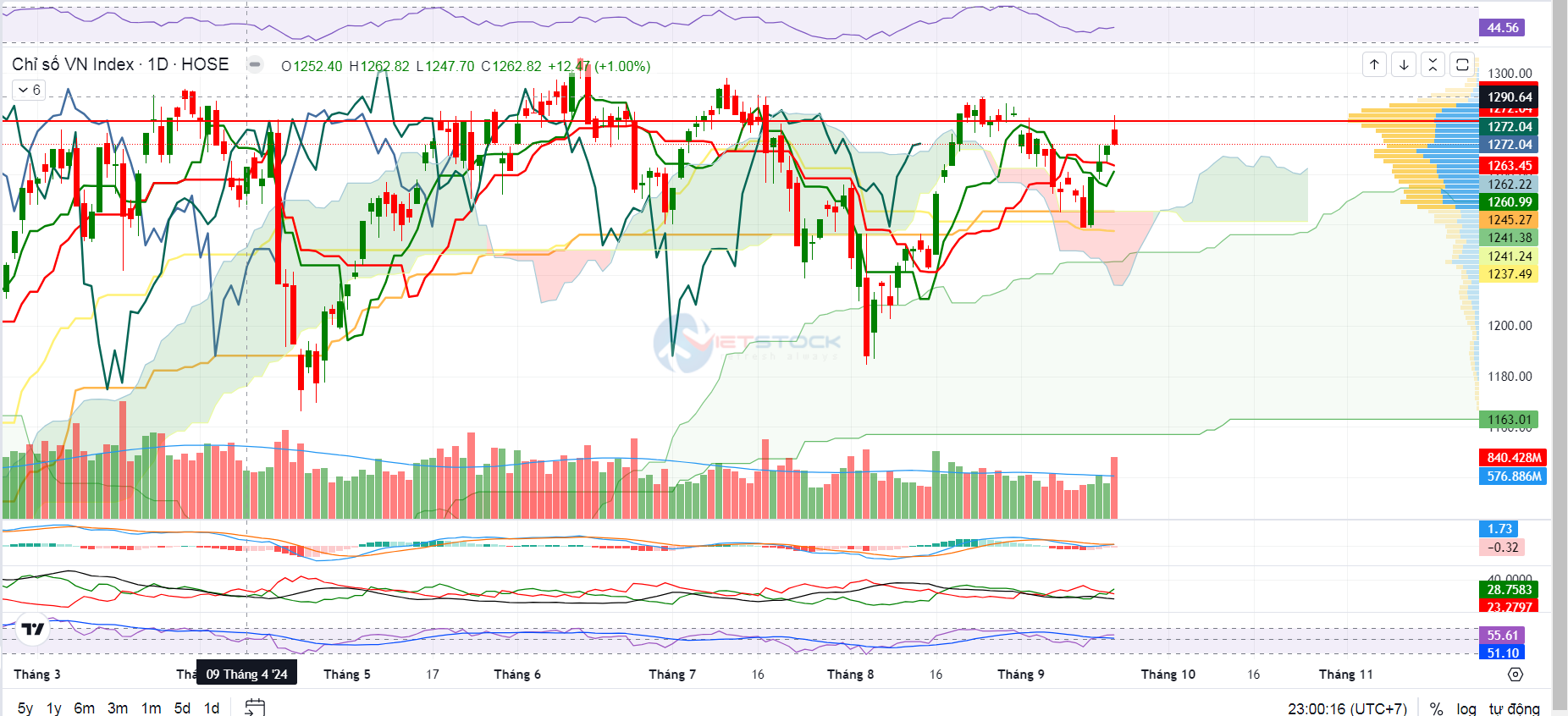 - giá có nến xanh, vượt được conversion line → có hy vọng hướng tới pivot 1260, baseline, đáy mây 1270