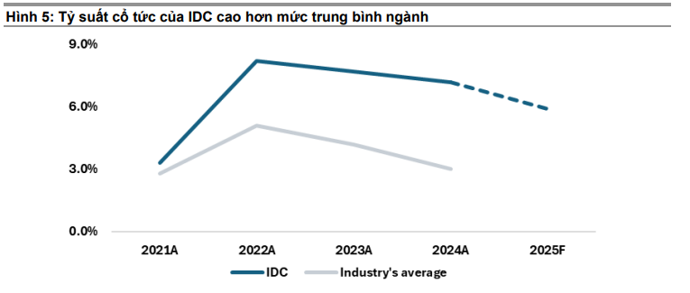 IDC nổi tiếng là doanh nghiệp “chăm” trả cổ tức. Với tỷ suất cổ tức kỳ vọng từ 5.3% - 9.2%, đây là mức sinh lời cao hơn lãi suất tiết kiệm, tạo thành “bộ đệm” an toàn cho nhà đầu tư nắm giữ dài hạn