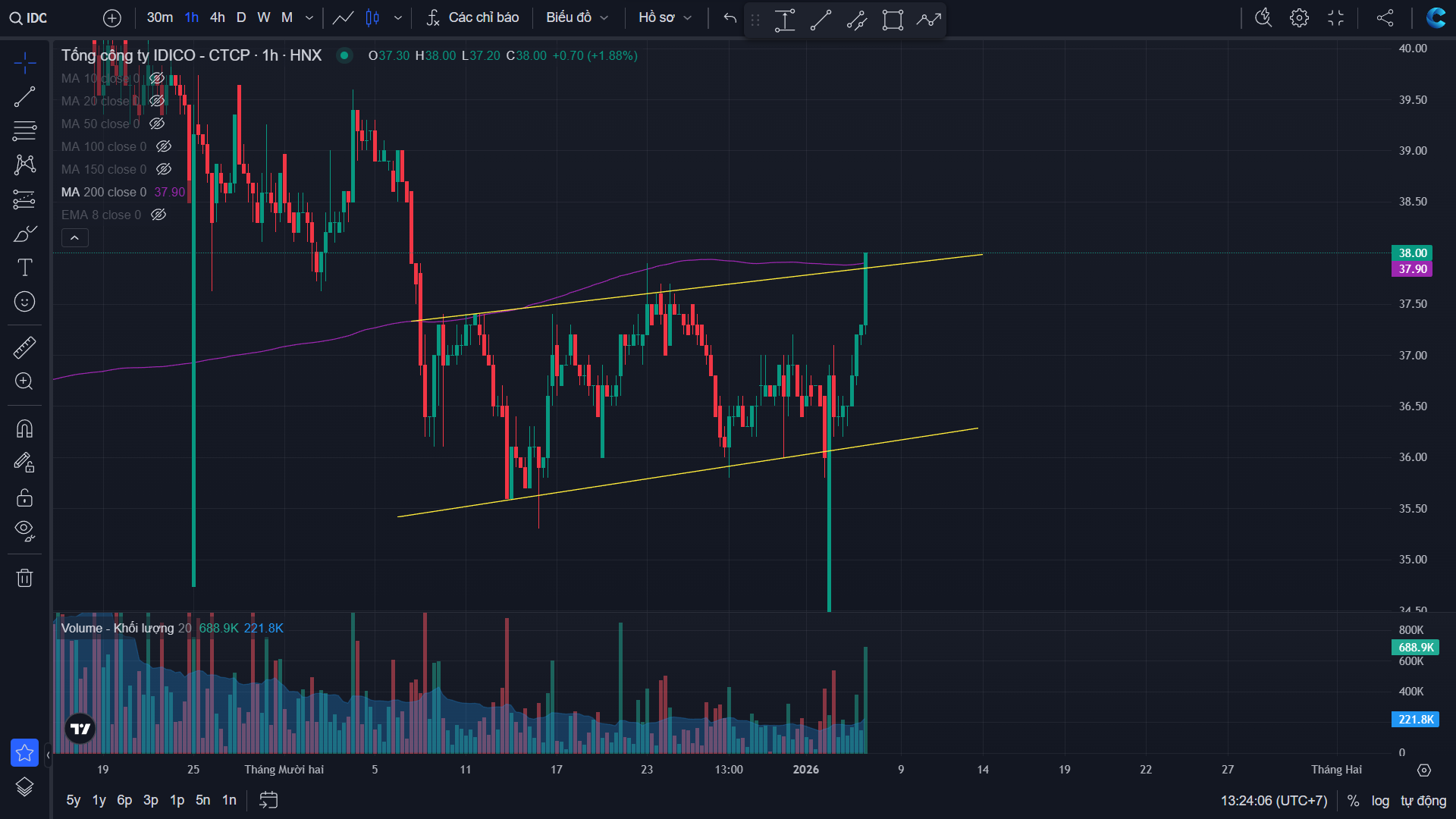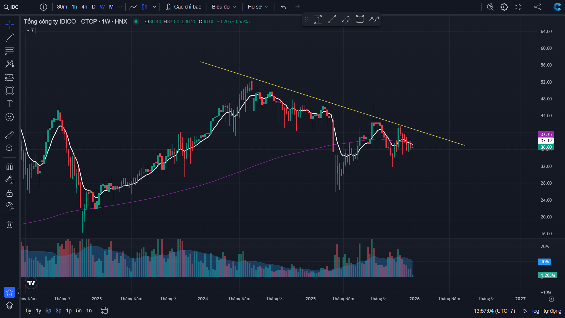 Khuyến nghị Mua IDC ở vùng giá 35.5-36.5, giá mục tiêu 44 - 45, giá cắt lỗ: thủng 34, thời gian nắm giữ dự kiến: 2 - 3 tháng.