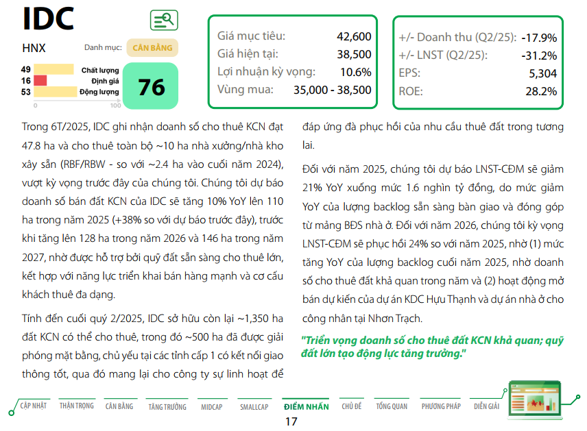 Năm 2025, IDC bước vào giai đoạn chững lại sau nhiều năm tăng trưởng nhanh, nhưng vẫn duy trì nền tảng tài chính vững chắc và dòng tiền ổn định. Danh mục các dự án khu công nghiệp đang triển khai quy mô lớn sẽ là yếu tố quan trọng giúp doanh nghiệp bước sang chu kỳ tăng trưởng mới từ năm 2026. Khi các khu công nghiệp mới đi vào hoạt động, IDC được kỳ vọng sẽ hưởng lợi kép từ doanh thu cho thuê đất tăng và hoạt động cung cấp điện – nước mở rộng theo.
