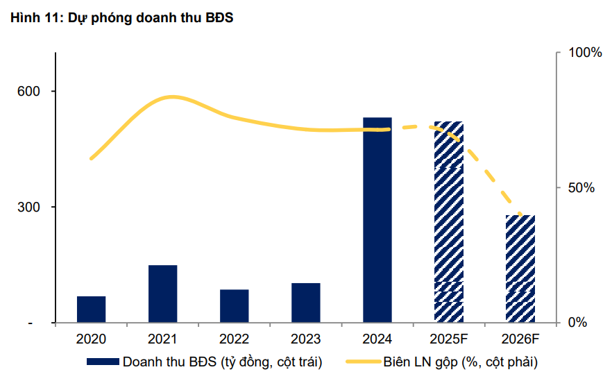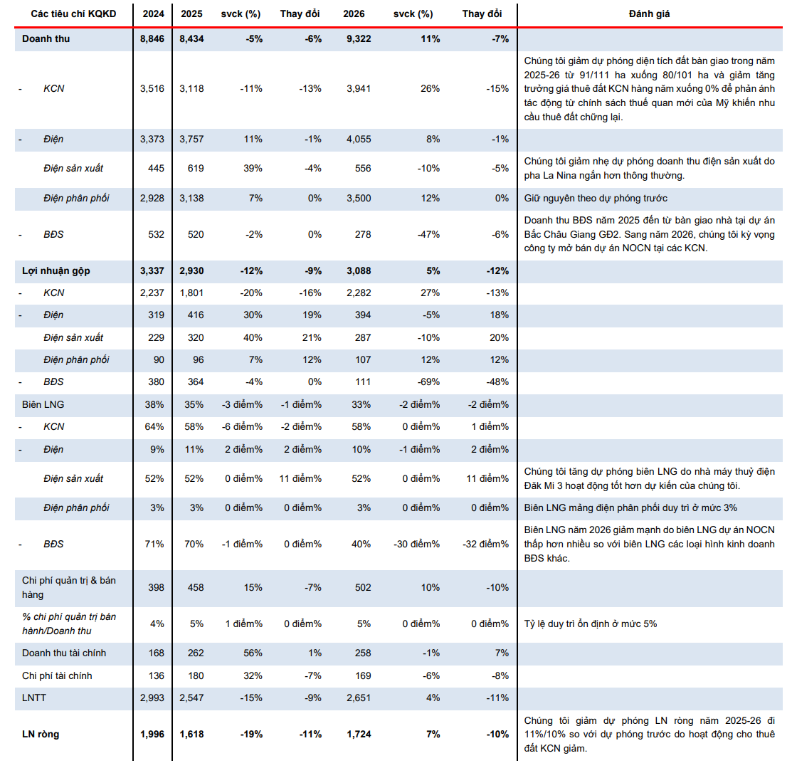 Giữ nguyên dự phóng doanh thu BĐS năm 2025 nhờ bàn giao shophouse tại dự án Bắc Châu Giang GĐ2 và bàn giao 7,000 m2 đất còn lại tại dự án KDC Trung tâm mở rộng phường 6. Sang năm 2026, kỳ vọng công ty bàn giao nhà tại dự án NOCN KCN Nhơn Trạch, dự kiến khởi công trong Q3/25. Qua đó, dự phóng doanh thu BĐS đạt 520/278 tỷ đồng (-2%/-47% svck), giảm 0%/6% so với dự phóng trước.