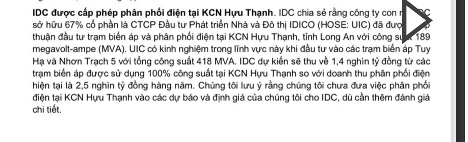 UIC phân phối điện cho các KCN của IDC thì lâu rồi, doanh thu đều đều 2 3k tỏi mỗi năm, grow đều theo nhu cầu sử dụng điện của KH nhà máy mới + inflation.