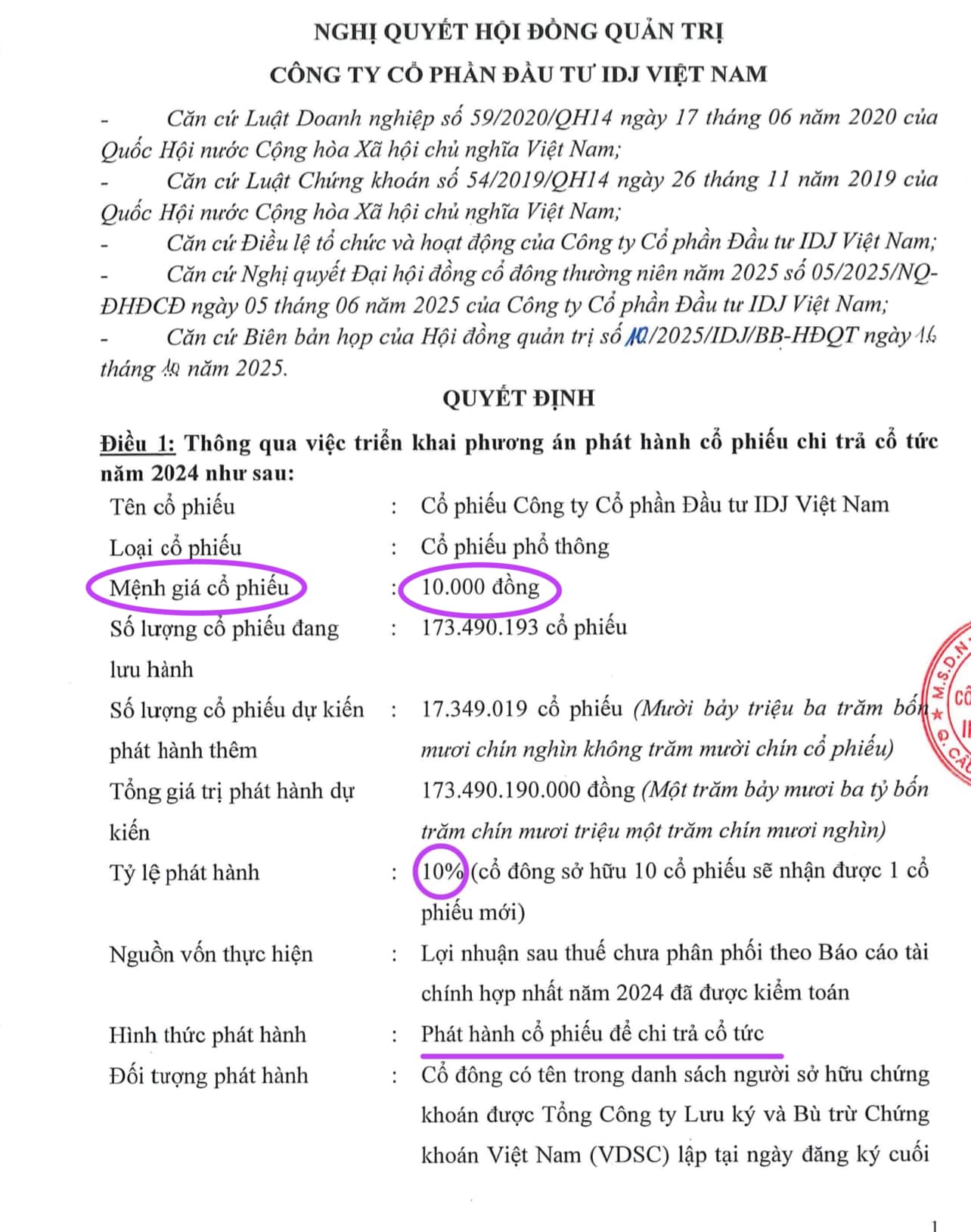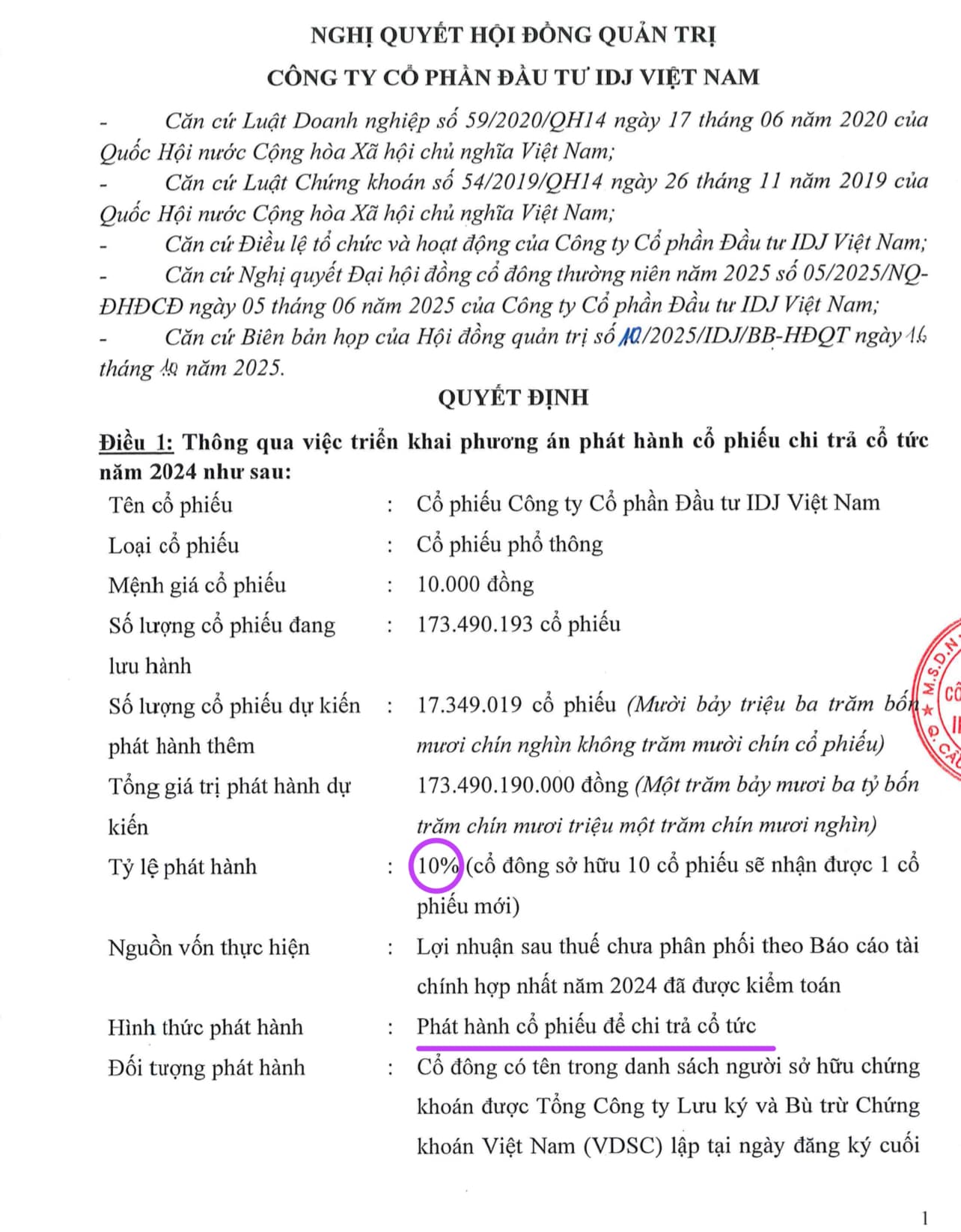 IDJ: CTCP Đầu tư IDJ Việt Nam thông qua việc phát hành hơn 17,34 triệu cổ phiếu trả cổ tức năm 2024 theo tỷ lệ 10:1. Thời gian thực hiện dự kiến trong quý IV/2025.