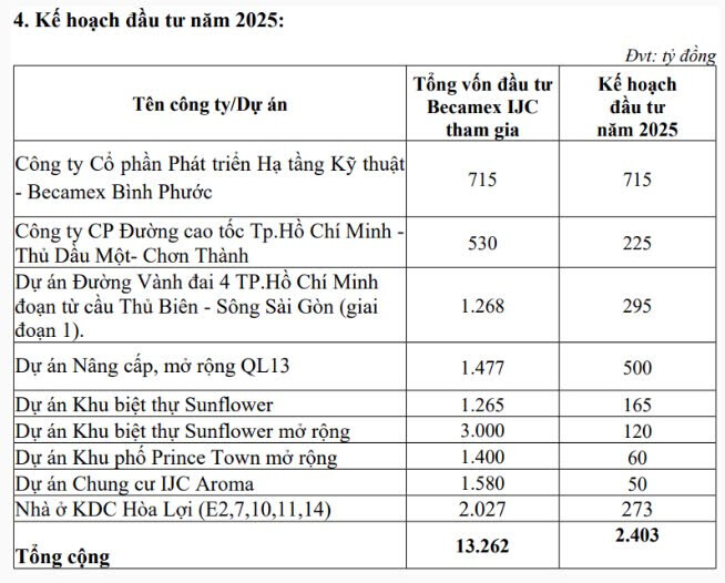 Nhằm thực hiện mục tiêu trên, IJC sẽ triển khai đầu tư và kiểm soát hiệu quả việc sử dụng vốn đầu tư tại CTCP Phát triển Hạ tầng Kỹ thuật Beamex Bình Phước (công ty liên kết); dự án đầu tư xây dựng đường Vành đai 4 TPHCM đoạn cầu Thủ Biên - Sông Sài Gòn (giai đoạn 1), dự án đường cao tốc TPHCM - Thủ Dầu Một - Chơn Thành; dự án nâng cấp mở rộng quốc lộ 13 và các dự án hạ tầng giao thông khác.