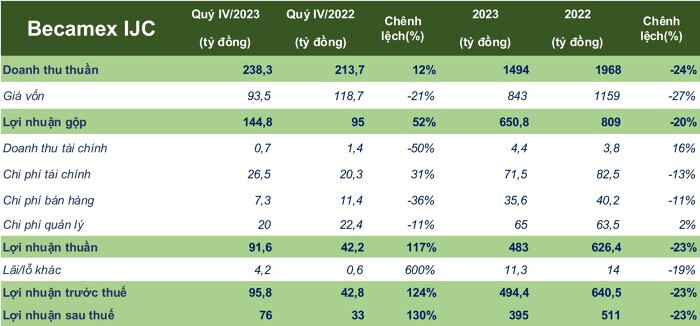 Quý IV/2023, Becamex IJC ghi nhận doanh thu thuần đạt 238,3 tỷ đồng, tăng 12% so với cùng kỳ năm 2022, sau đó, nhờ giảm được phần lớn giá vốn và các khoản chi phí nên doanh nghiêp ghi nhận mức lợi nhuận sau thuế tăng 130%, đạt 76 tỷ đồng.
