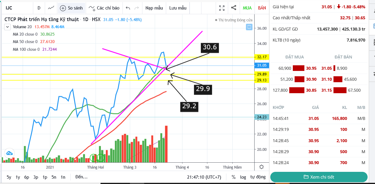 Dự IJC sẽ tiếp tục bị bán tháo từ áp lực vol 11tr hàng về, có thể đạp xuống vùng 29.9 tệ thì đạp thẳng về 29.2 sau đó bật ngược lên cuối phiên để không bị gãy trendline.