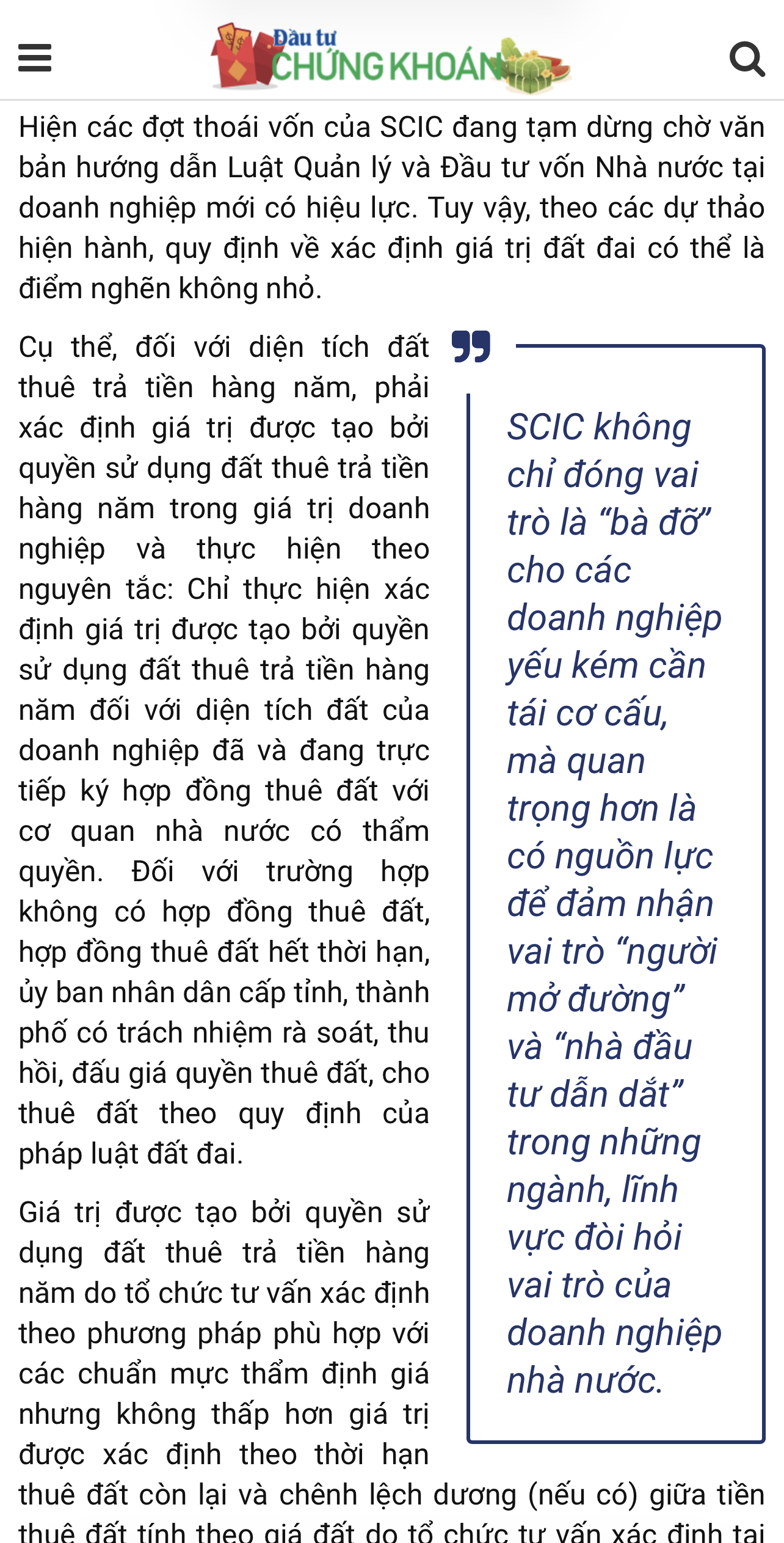 Hiện các đợt thoái vốn của SCIC đang tạm dừng chờ văn bản hướng dẫn Luật Quản lý và Đầu tư vốn Nhà nước tại doanh nghiệp mới có hiệu lực. Tuy vậy, theo các dự thảo hiện hành, quy định về xác định giá trị đất đai có thể là điểm nghẽn không nhỏ.