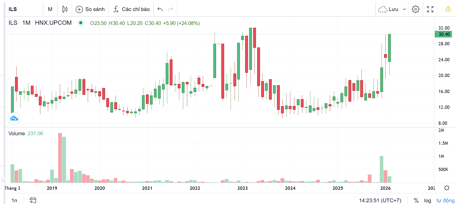 tôi đánh giá hôm nay là phiên hút cổ. phiên vol to đầu tiên, tương tự phiên ngày 15-10-2025 của VEC, sau đó là chuỗi tăng x6 lần, vì hàng về 1 mối. với 200K ILS giao dịch hôm nay, có nghĩa toàn bộ nhỏ lẻ gần như out chốt lời hả hê. đừng quên rằng: BÊN MUA trong deal vẫn phải gom 5% trên sàn, để đủ nắm trên 51%, nên những phiên nhỏ lẻ nhả hàng ntn là mừng lắm, họ gom lại 1 cục rất lớn. trước 1 con sóng lớn nhất của ILS (tính từ khi niêm yết năm 2018), lời khuyên cuối cho ae nào còn lăn tăn là mua giá 27-28 nếu có thể (tăng không đáng kể so với giá 22-23 lúc mở pics này) - lúc mở pics này còn đầy rẫy rủi ro chôn vốn vì ko biết có thoái ko, khi nào thoái… nhưng giờ ko còn rủi ro đó mà chả mới chỉ tăng 20% là mức hời.
