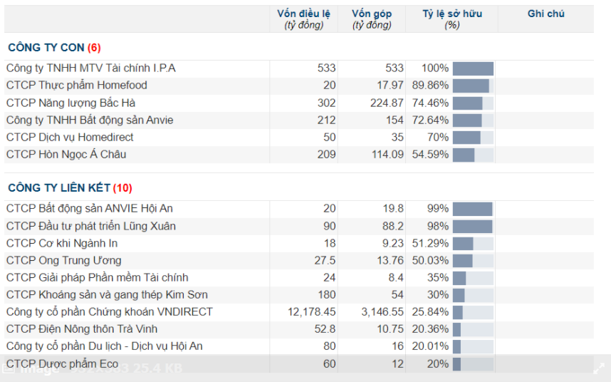 - Ngoải ra, còn có một số công ty liên kết khác như: CTCP Dịch vụ HOMEDIRECT, Công ty CP Thực phẩm HOMEFOOD, CTCP Du lịch Bình Định,… Nhiều công ty có tỉ số tài chính đẹp, tỉ lệ nợ vay thấp, lượng tiền mặt cao, dòng tiền tăng trưởng ổn định, hứa hẹn lợi nhuận sẽ đóng góp lớn cho KQKD của IPA các năm tiếp theo.